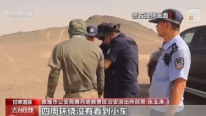 敦煌市公安局雅丹地貌景区治安派出所民警张玉涛:大风刮得特别厉害,然后我们就赶到现场,四周环绕没有看到小车,然后我就和我同事就继续驾车又往前走了一下,走了大概有10多公里,然后还是没找到。