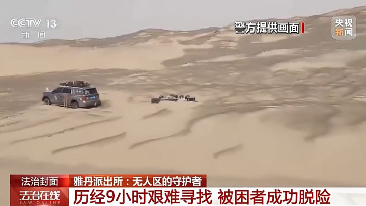 就这样经过了9个多小时的艰难寻找,警方终于在一个沙丘后的低洼处发现了被困者的车辆,当时,这名被困者驾驶的汽车已经陷进了沙坑中动弹不得。