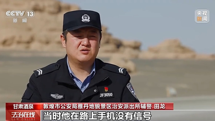 敦煌市公安局雅丹地貌景区治安派出所辅警田龙:当时他在路上手机没有信号,也联系不到他,然后我们所长就通过这个视频下方留言,告诉他在有信号的地方要联系我们。因为毕竟咱们这前两年也出现过人员被困的现象,都是比较严重的,然后就给他留言了,主要是劝阻他不要进入无人区。